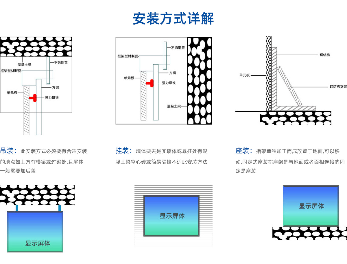 采用高品质红绿蓝三种芯片封装在一颗表贴灯珠里,将表贴灯珠按一定的间距均匀的贴在电路板正面并过焊固定,线路板背面贴有驱动与控制等电子元器件,再用塑胶套件固定和保护成品线路板,这便是室内LED显示屏基本单元。
